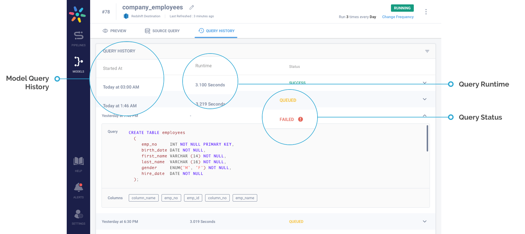 Query History: Get a complete history of individual queries. Details on runtime, duration, status and output columns affected can be found. This is your go-to place to find the query’s chronicle of events.