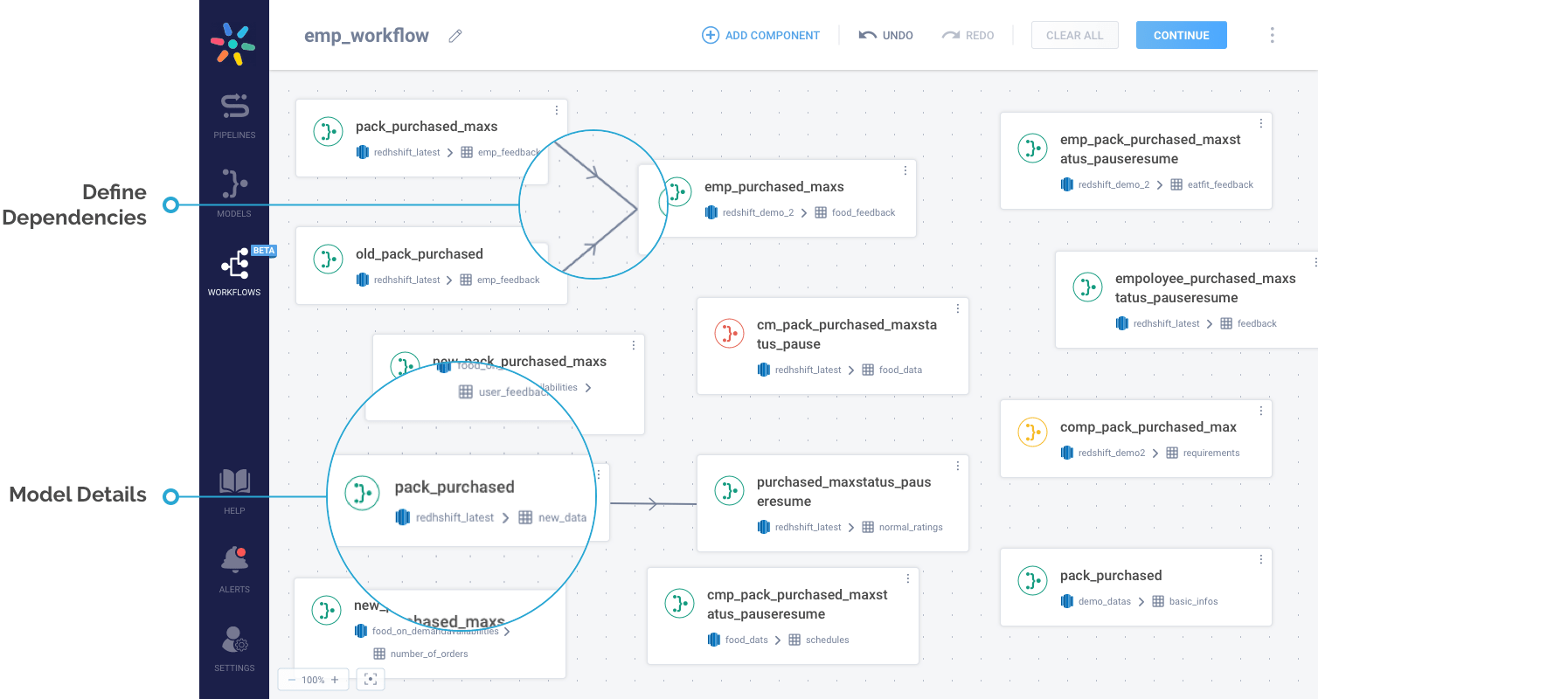 Workflows: Define dependencies between your models through Workflows. Workflows allow you to build a DAG (Directed Acyclic Graph) from within the tool, allowing you to optimize interdependencies between data models. Let’s go back to our initial example of extracting retention report by source. To achieve this, you will have to initially merge the data from the attribution table with the user table. You will then have to join this data with the user activity table, run aggregates on it to derive the final output. This 3 step process can be easily automated via drag and drop in Hevo’s Workflows. Cool, isn’t that?