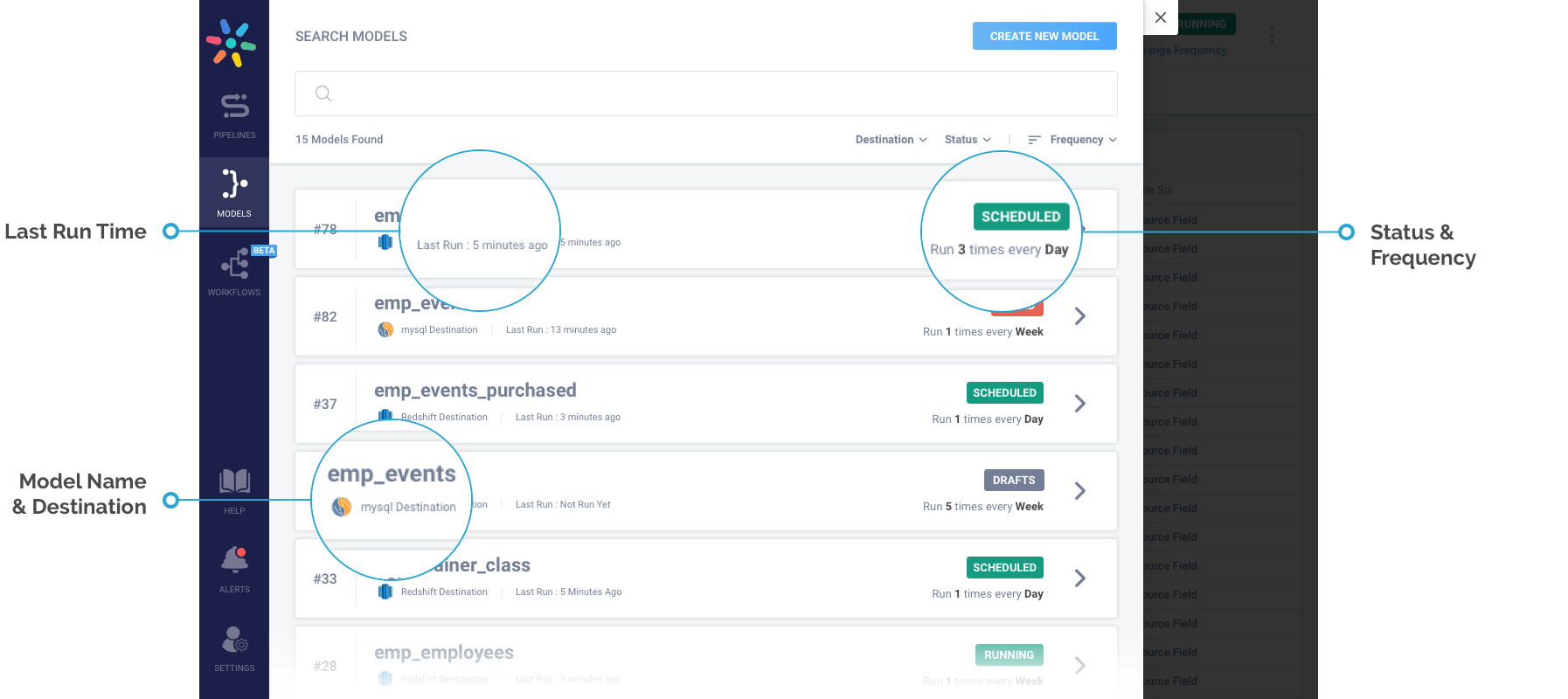 Bird’s Eye View: Models are accompanied by a dashboard that provides an overview of all of the Models written on your Hevo Account. Detailed info about destination, status, frequency, etc. are all visible in one window for you to take action.