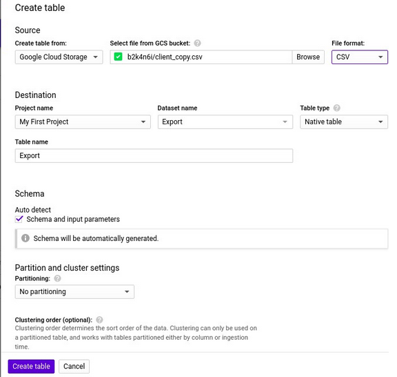 - Click Create table.