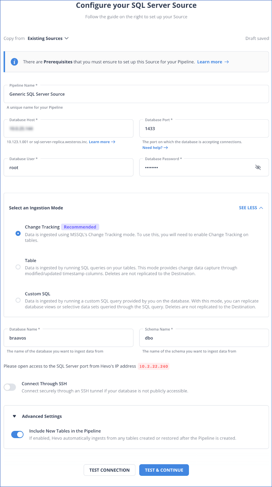 Provide the following details while setting up the SQL Server source: