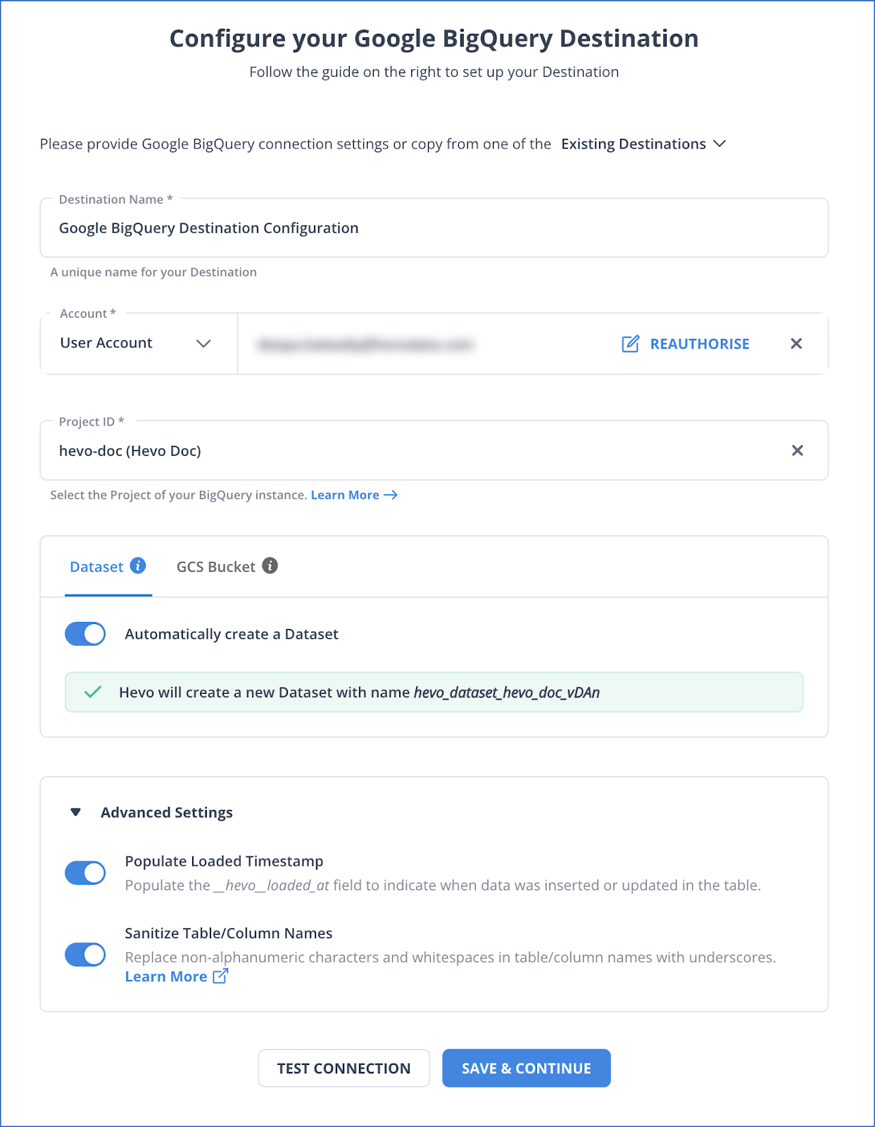 - Configure the destination table.