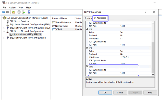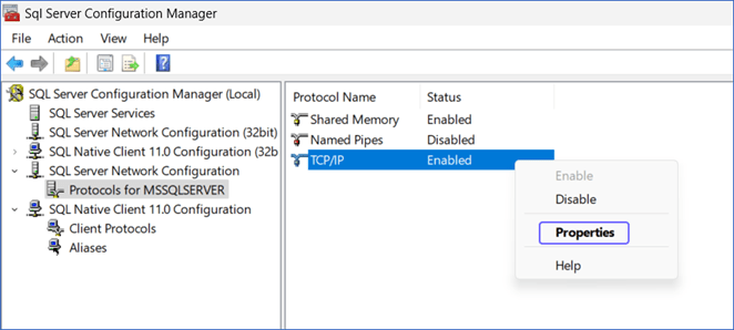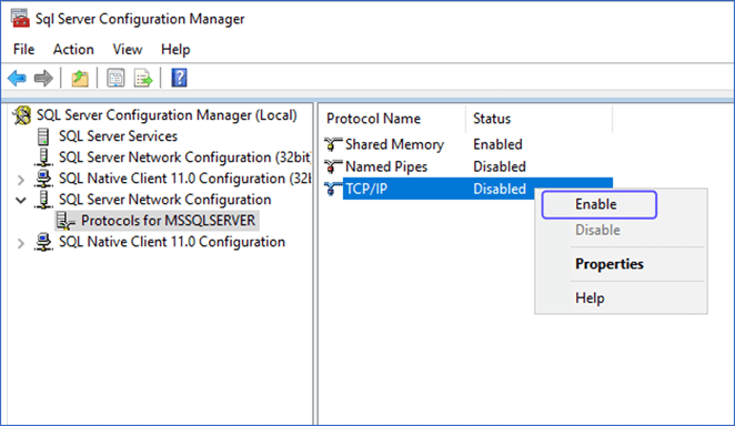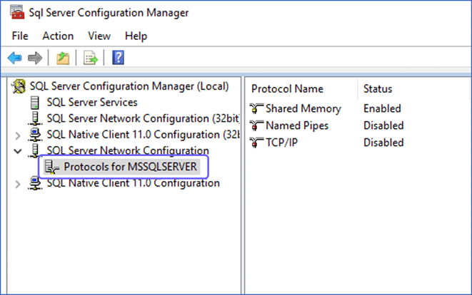 - Click Protocols for your MS SQL Server Instance Name (default name is MSSQLSERVER).
