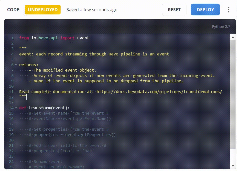 Hevo provides a flexible and powerful console to set up inflight transformations. There are 2 ways to set up inflight transformation on Hevo, one is by using our drag-and-drop interface, and the other is by using the Python console.