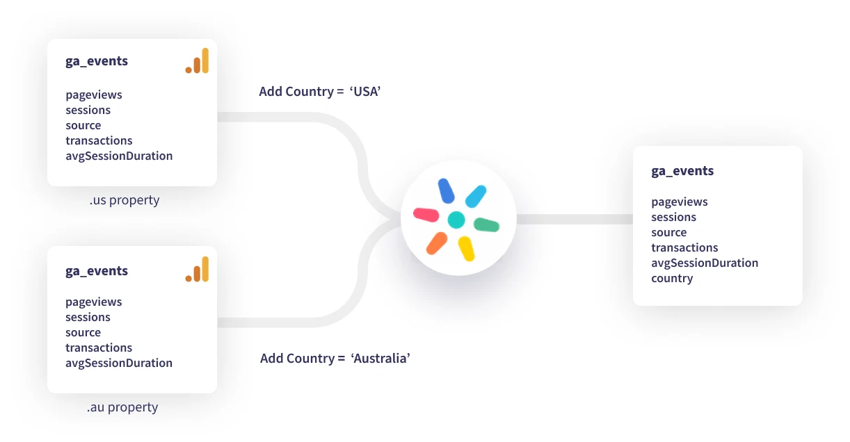 They would need to load the data for each region from Google Analytics to their data warehouse while adding the respective location name for each record. This can be easily achieved by creating a pipeline with inflight transformation each property on Google Analytics.