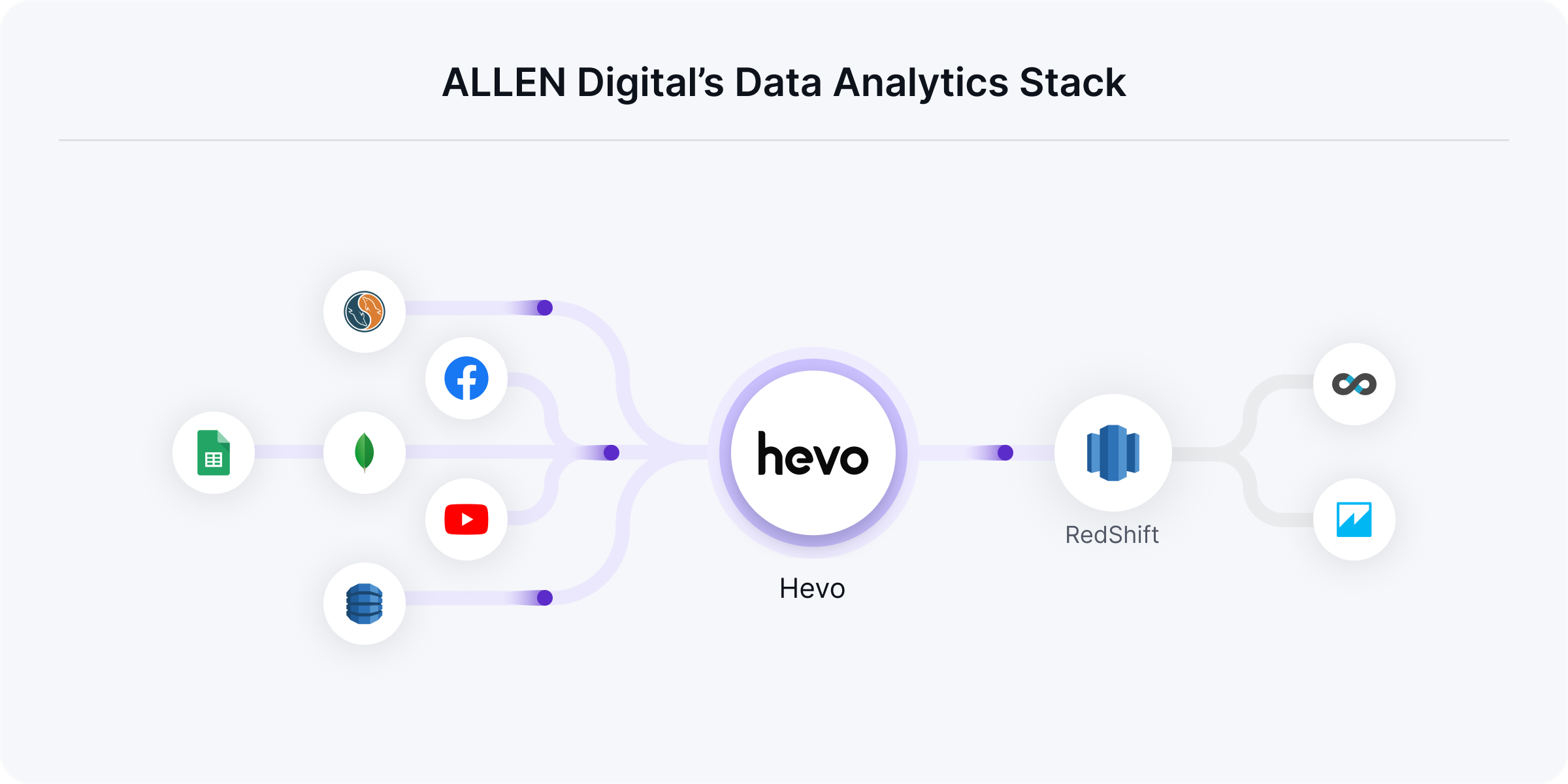With production and analytics separated, ALLEN Digital selected Hevo Data as the first tool in the analytics stack, recommended by team members who had prior experience with the platform. The results were immediate, with setup taking only three days. Onboarding third-party sources was similarly fast, with most integrations configured in just 30–40 minutes.