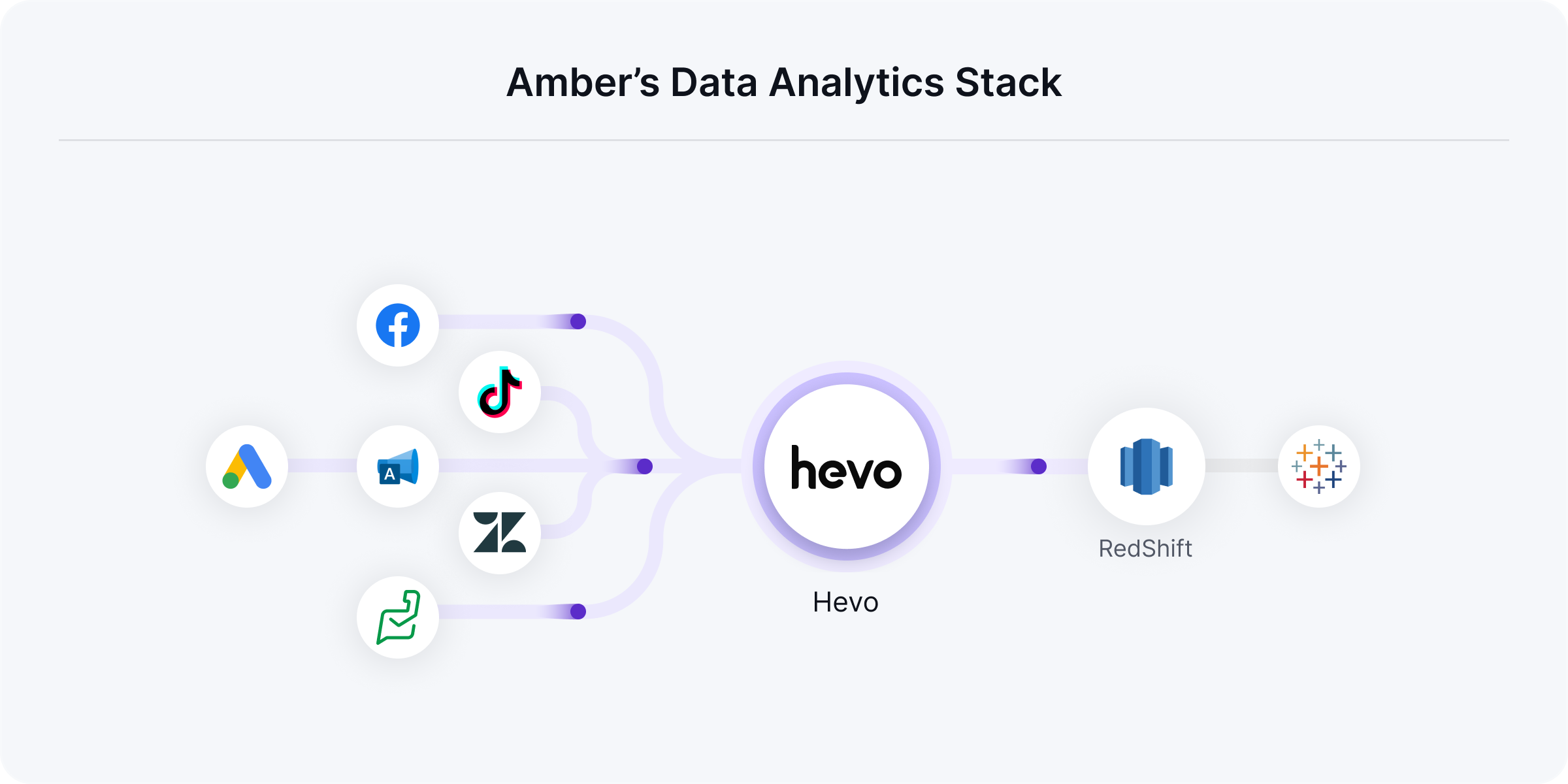Today, roughly 80% of the data flowing into AmberStudent's Redshift warehouse is marketing data – platform performance, user acquisition, regional traffic patterns, and conversion rates across channels. The remaining 20% covers chat data from Zendesk and Zoho Desk, used by the product and sales teams to understand user journeys and support quality.