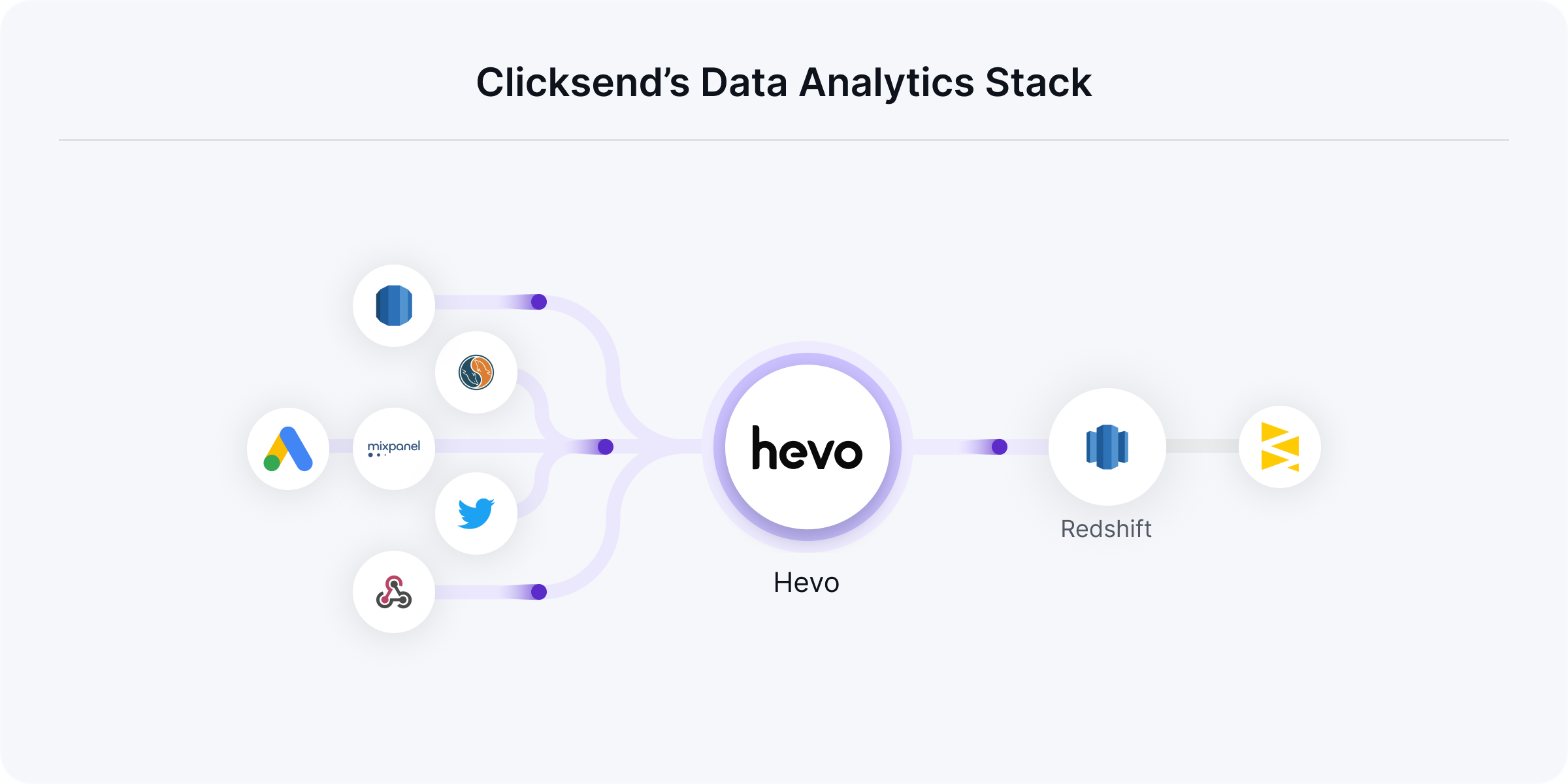 Using Hevo ClickSend built date pipelines that helped them pull data from different source systems like MySQL, Amazon Aurora, Webhooks, Google Adwords, Mixpanel, Twitter Ads and dump it into AWS Redshift data warehouse. With Hevo, ClickSend achieved data integration, with AWS Redshift they were able to build a single source of truth, and with Sisense they were able to get rid of spreadsheets.