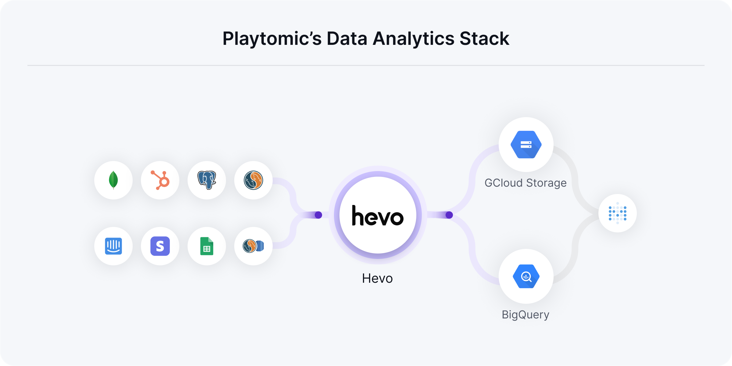 Playtomic is using Hevo to pipeline data from multiple data sources including Amazon Aurora MySQL, MySQL, PostgreSQL, MongoDB, Stripe, HubSpot, Intercom, and Google Sheets to their Google Cloud Storage Data lake and BigQuery Data Warehouse. They finally load this data to Metabase to make dashboards, run queries, and report.