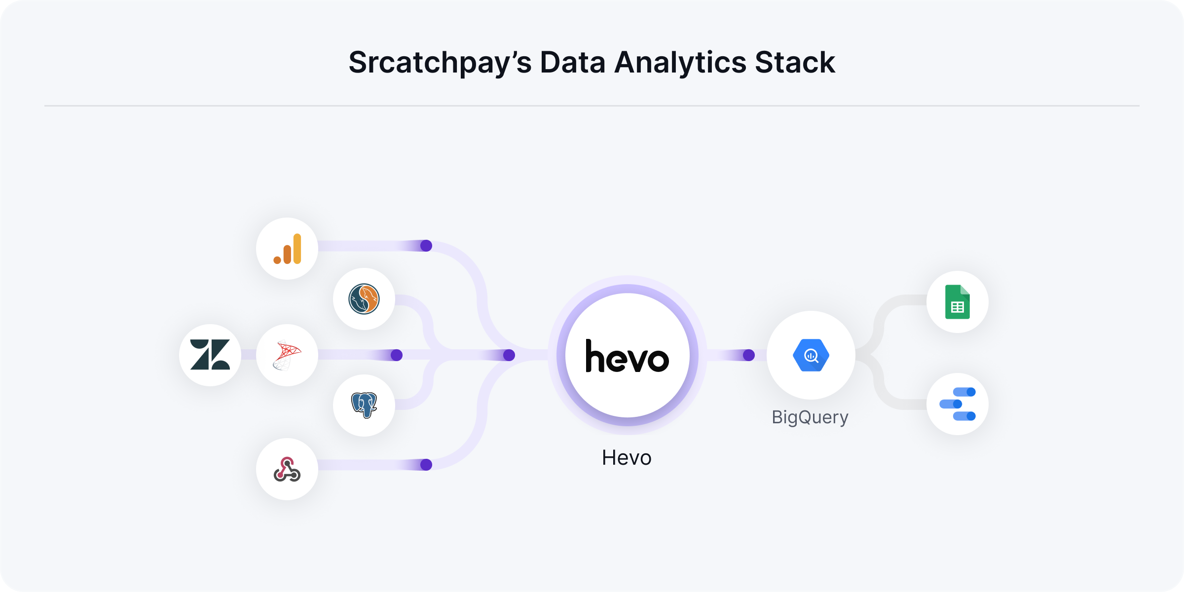 Using Hevo, Chris, and his team built their advanced data pipelines that aggregate their data across multiple sources such as MySQL, Postgres, Google Analytics, their payment service, and Zendesk into BigQuery. Using Google Cloud as a single source of truth has worked greatly for Scratchpay and it allows members across all the teams to access data through BigQuery, Google Sheets, and Data Studio.