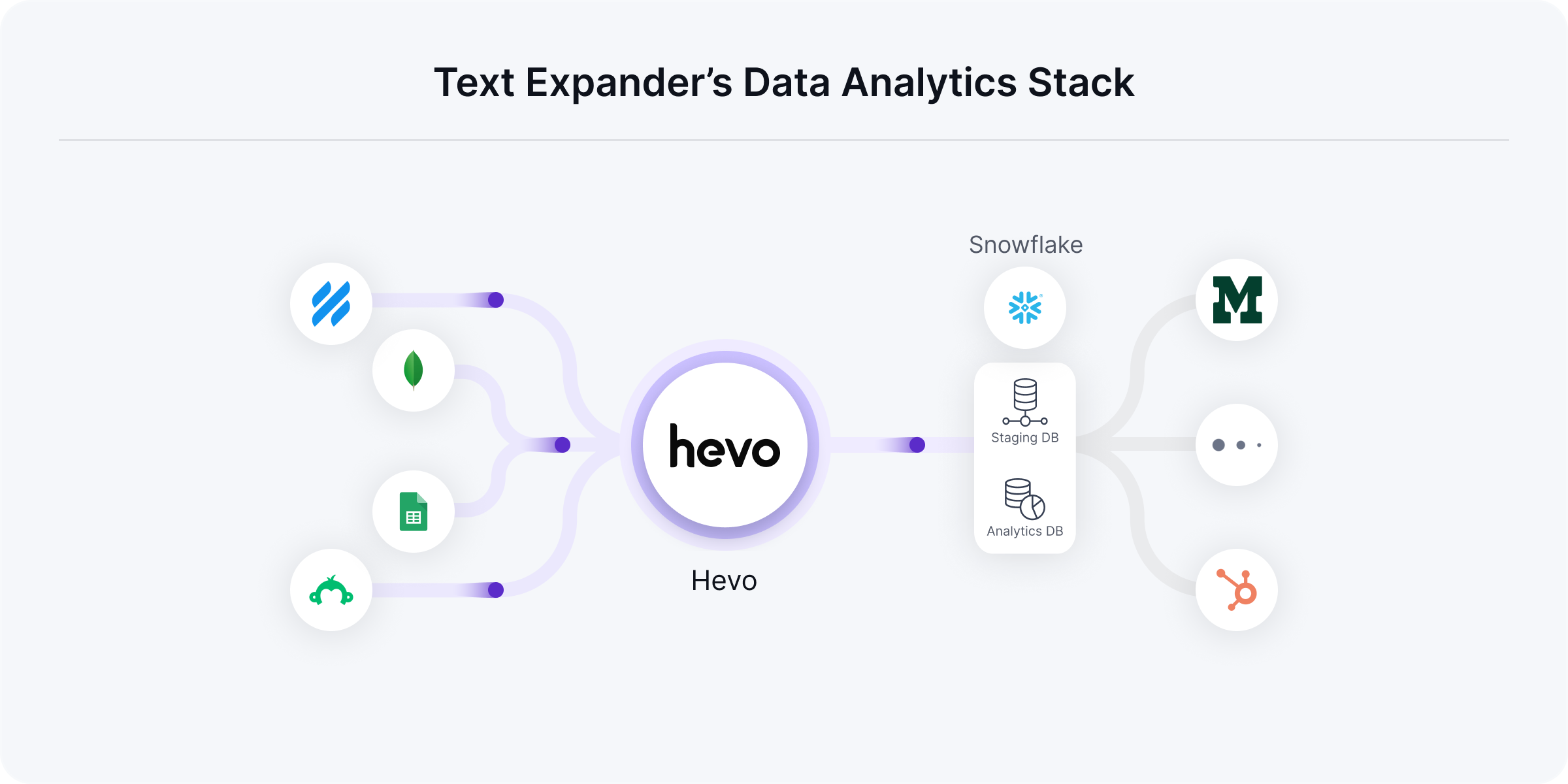 Using Hevo, TextExpander has built a very mature data architecture. Hevo is used to manage the entire data ingestion from the sources to Snowflake, model the data within the staging database using Hevo models, and then stored in the analytics database. All the raw application data from MongoDB as well as data from SaaS sources like Google Sheets, SurveyMonkey, HelpScout, etc. goes into ODS- operational data store- within Snowflake. From the ODS, the data is processed within a staging database. The final output, the modeled data for analytics, is stored in a database where downstream apps (Mode, Mixpanel, Hubspot CRM, etc) and all users have access to.