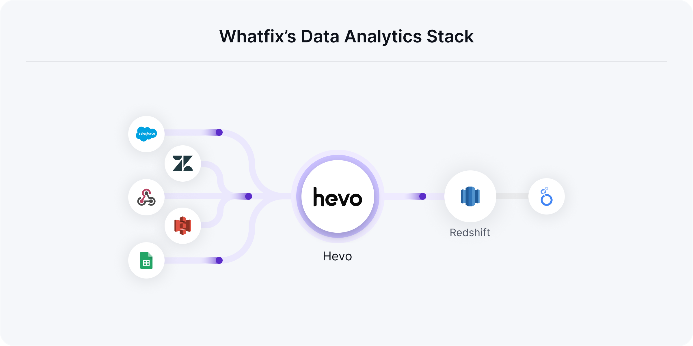 Whatfix is currently using Hevo’s pre-built integrations to pull data from Salesforce, Zendesk, Amazon S3, and Google sheets data sources. They’re using webhooks to pull data from ClientSuccess and SaaSOptics. All of this data undergoes a series of transformations ranging from simple transformations like date-stamping and JSON flattening to complex Python-based transformations. The transformed data is then aggregated at Whatfix’s Amazon Redshift data warehouse and consumed by different team members in the form of reports created on Looker.